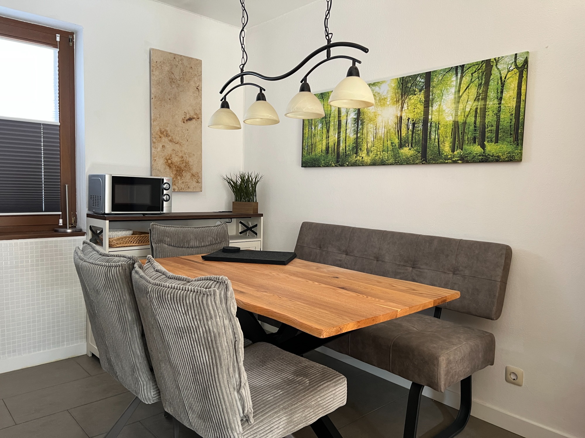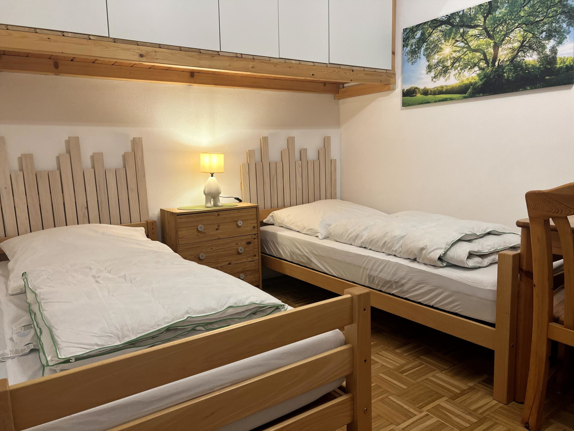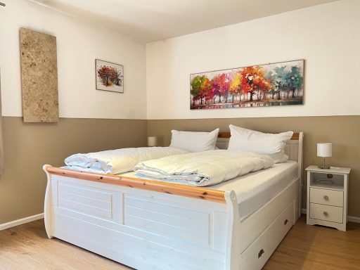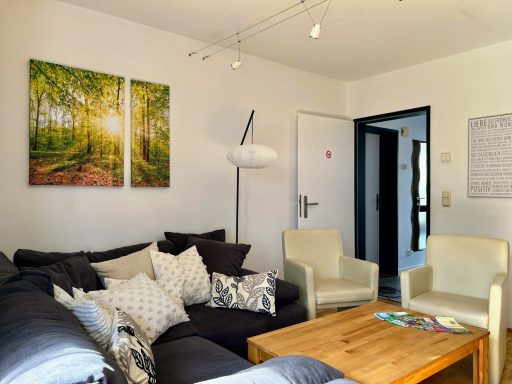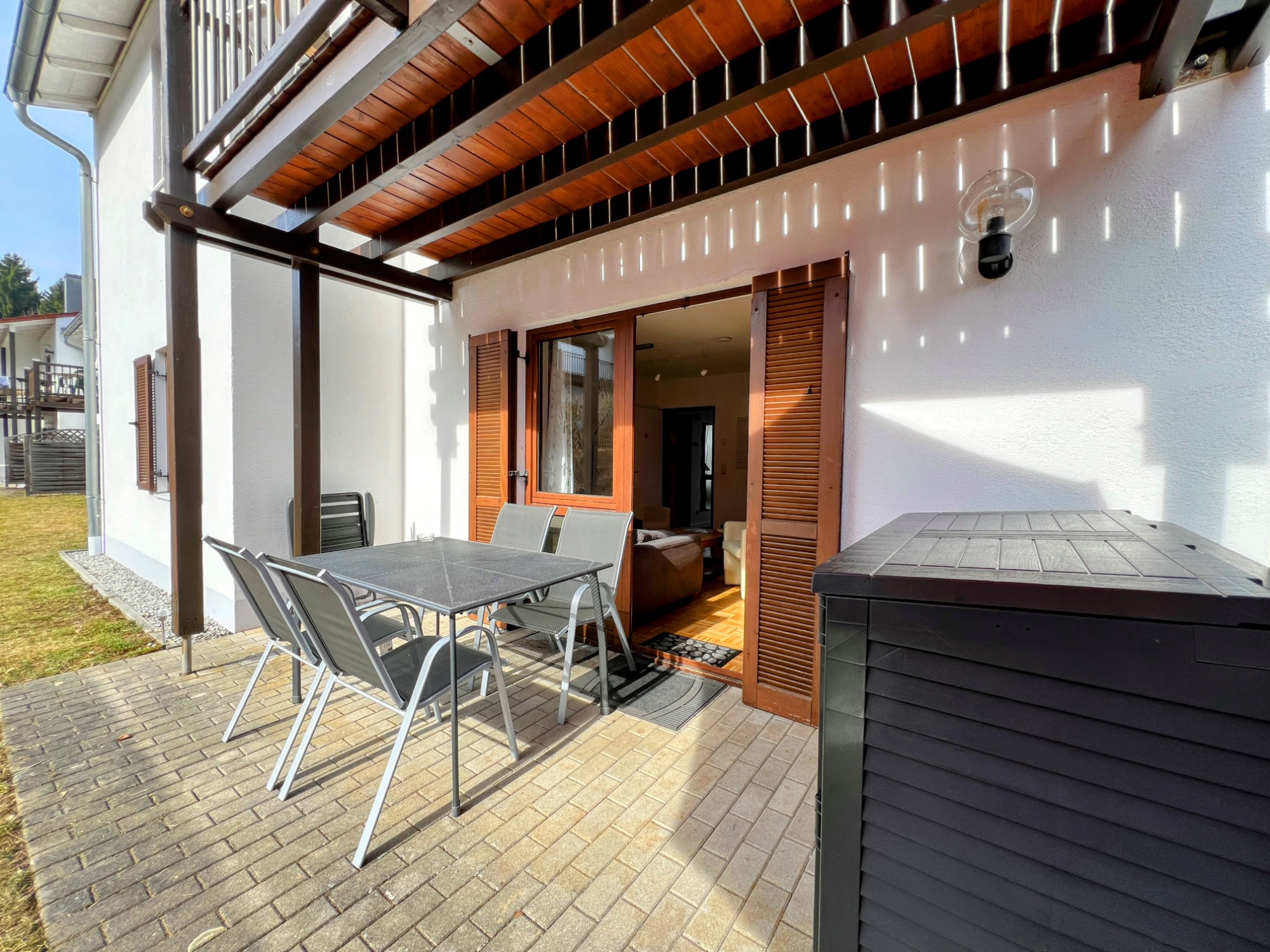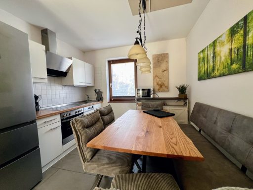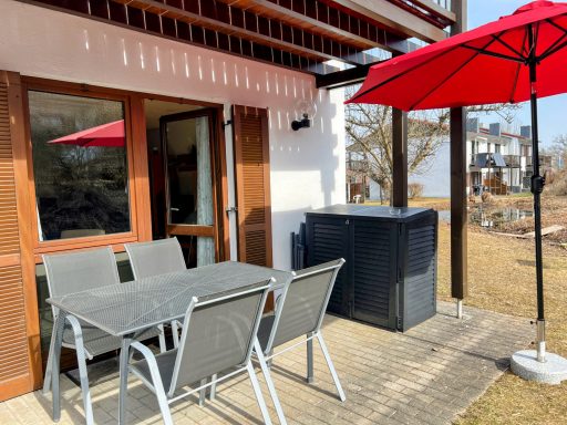 Unser Eichbär Quartier mit der Hausnummer 42EG ist eine Wohnung im Erdgeschoss und befindet sich ebenfalls am Ende einer Häuserreihe in der Nähe des Hauses. Daher sind beide Einheiten auch gut für befreundete Familien geeignet. Das Quartier ist 80 m2 groß und bietet mir seinen zwei Schlafzimmern Platz für 6 Personen (Schlafzimmer 1 mit Doppelbett, Schlafzimmer 2 mit zwei Einzelbetten, Schlafcouch im Wohnzimmer). Die Küche ist voll ausgestattet mit Geschirrspüler, Mikrowelle und großer Kühl-/Gefrierkombi. Im Sommer sitzt man gemütlich auf der großen Terrasse, im Winter spendet der Pelletofen wohlige Wärme. Damit das Auto nicht allzu voll gepackt werden muss, ist für die Kleinsten alles da wie Reisebett, Hochstuhl, Bettgitter, Tritthocker sowie Kindergeschirr und -besteck. Die sonnige Terrasse lädt zum Entspannen und Spielen ein, ein großer Sonnenschirm ist ebenso vorhanden wie ein großer Kugelgrill. Ein 55-Zoll-Smart-TV mit Streaming-Funktionen und eine PlayStation 4 mit zwei Controllern und einer Spieleauswahl sorgen für Abwechslung auch bei Regenwetter, an verschiedene Gesellschaftsspiele und Bücher haben wir ebenfalls gedacht. Im Kinderzimmer steht außerdem ein zweiter Smart-TV mit weiterer Spielekonsole..